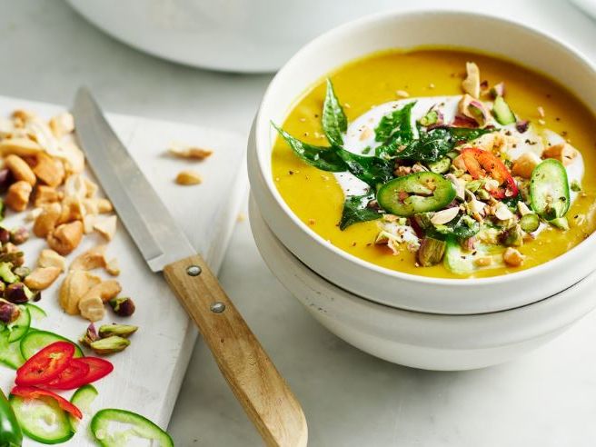 - Ladle soup into bowls; drizzle with reserved coconut milk and top with toasted curry leaves, chopped nuts and sliced chilli.
