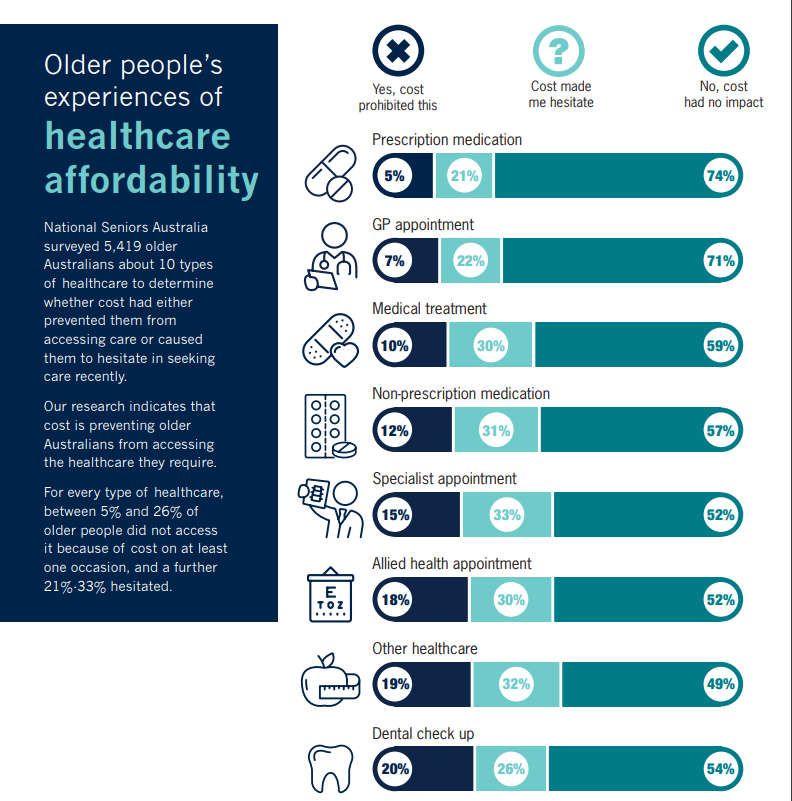 A new report from the National Seniors Research Team, based on a survey of nearly 6,000 older people, shows that in recent years, 68% had either hesitated over the cost of one or more forms of healthcare, or had gone without entirely.